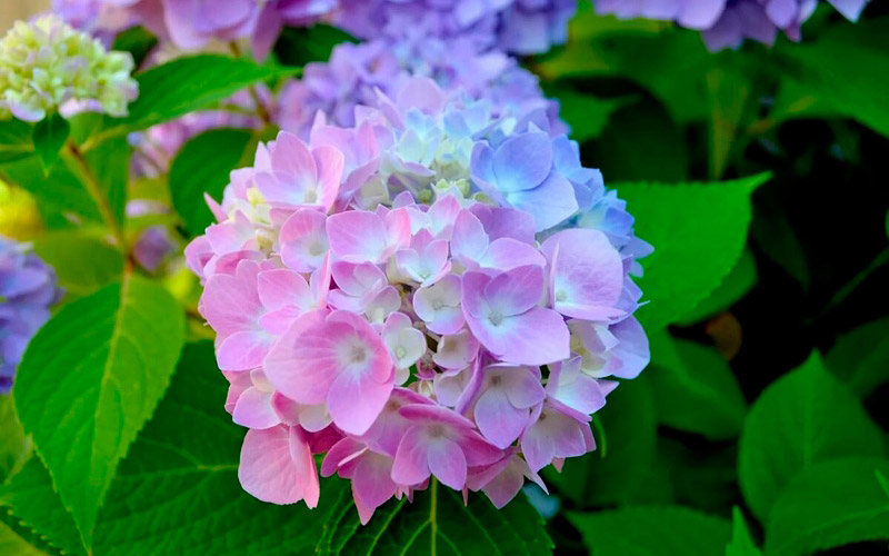Гортензия бывает нескольких видов. Ранее мы рассказывали о древовидной и метельчатой разновидностях, которые больше подходят для возделывания в зонах суровым климатом, таких как Урал, Сибирь и Север. Для южных зон рекомендуется тенелюбивый вид – крупнолистная или садовая гортензия, которую можно использовать в групповых и одиночных посадках. Зацветает она в августе бесполыми цветками, которые бывают розовыми, с тёмно-карминовыми мазками, голубые, белые и сиреневые. Голубые и синие бутоны можно получить, если поливать растение солями железа и квасцами.