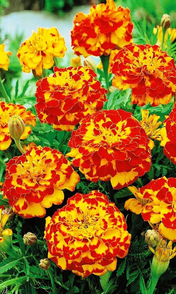 Бархатные соцветия изумительной красоты. Куст компактный, густо-облиственный, в период цветения весь покрывается яркими, двуцветными, оранжево-красными, с золотистыми краями цветками, собранными в махровые соцветия. Используют для клумб, рабаток, бордюров и украшения...