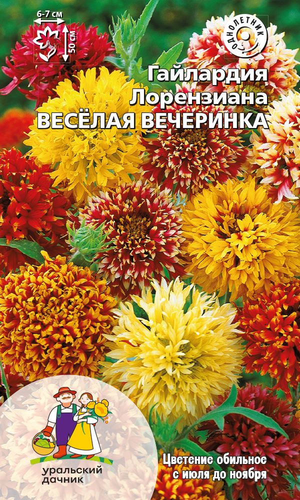Очень привлекательная смесь махровых гайлардий. Растение высотой около 50 см, стебель и листья опушены мягкими волосками. Соцветия до 6-7 см в диаметре на длинных цветоносах, напоминают пушистые помпоны. Язычковые цветки зубчатые, раскрыты в виде звёздочек. Цветёт обильно...