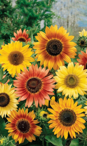Весёлая смесь из махровых и простых подсолнухов разнообразных оттенков. Высота растений 80-200 см. Соцветия диаметром 20-30 см. Цветёт с июня по сентябрь. Используют для заднего плана высоких бордюров, декорирования заборов и хозяйственных построек, на...