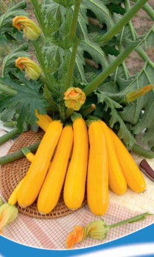 Раннеспелый суперурожайный кустовой гибрид. Плоды цилиндрические, солнечно-жёлтые, гладкие, глянцевые, длиной до 30 см, нежные, очень сочные. Ценность: высокая урожайность, оригинальная окраска плодов, холодостойкость, отличные вкусовые качества, высокая устойчивость к болезням. Рекомендуется для свежего употребления, переработки и консервирования...