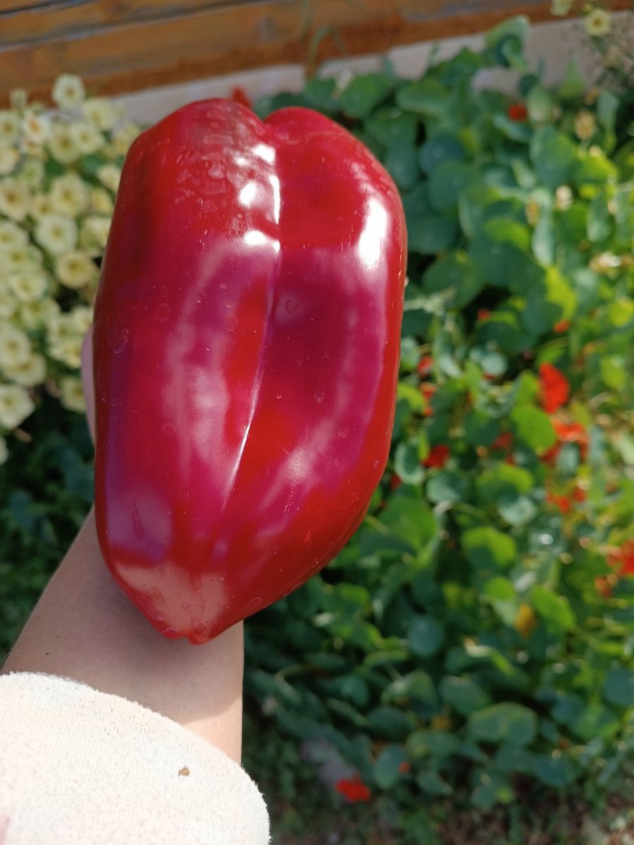 Раннеспелый, плоды-гиганты размером с литровую банку! Плоды вытянутые, красные, очень крупные, весом до 400 г, толщина стенки 1,2 см, ароматные, сочные, сладкие. Завязывает плоды даже в неблагоприятных условиях.