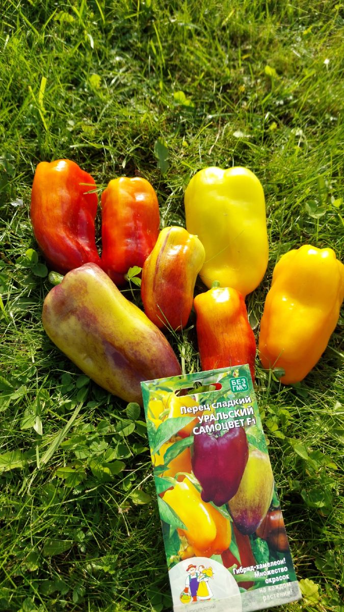 Современный среднеспелый гибрид Челябинской селекции для открытого грунта и плёночных теплиц. Растение полураскидистое, средней высоты. Плод пониклый, конусовидный, глянцевый, окраска в технической спелости фиолетовая, затем переходит в переливы жёлтого, оранжевого и красного. Число гнёзд 3. Масса плода 120 г, толщина стенки 6-8 мм. Плоды отличного вкуса. Универсальное использование.