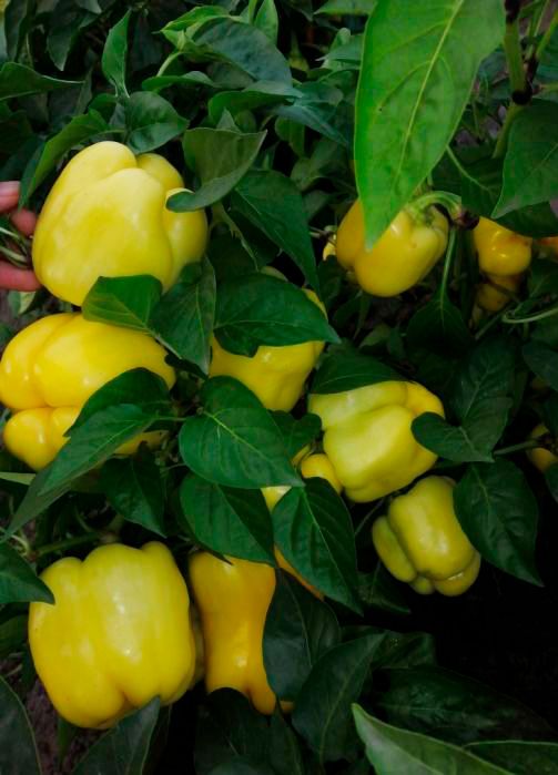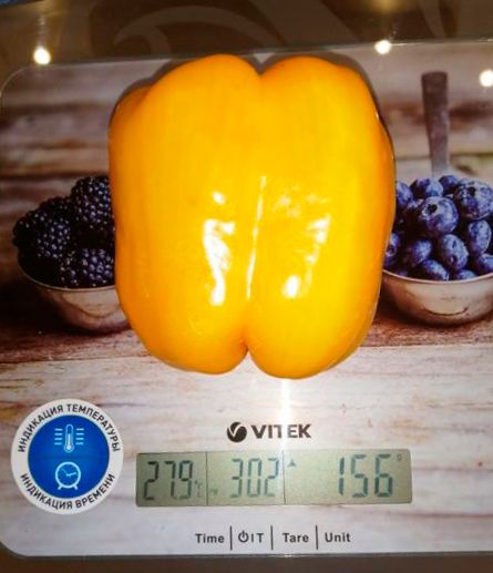 Урожайный среднеспелый сорт для выращивания в открытом грунте и под плёночными укрытиями. Плоды лимонно-жёлтые, пониклые, цилиндрической формы, длиной до 10 см, массой до 170 г. Толщина стенки 6-7 мм. Мякоть сладкая, сочная, ароматная.