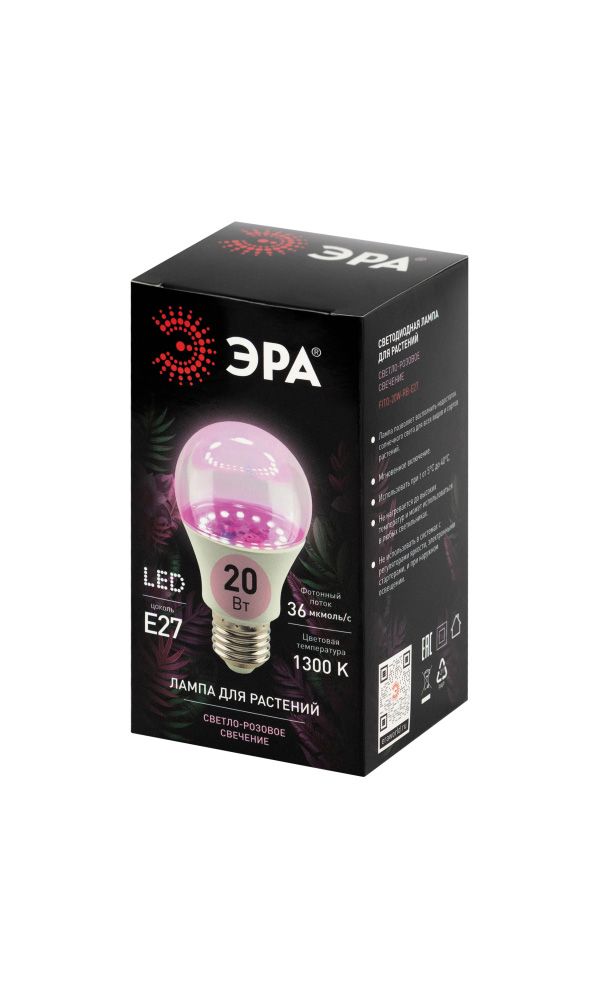 LED фитолампа ЭРА FITO-20W-RB-E27 не нагревается до высоких температур и безопасна для использования в любых светильниках. С длительным сроком службы до 30 000 часов наблюдайте за здоровым ростом своих растений и ярким цветением круглый год!