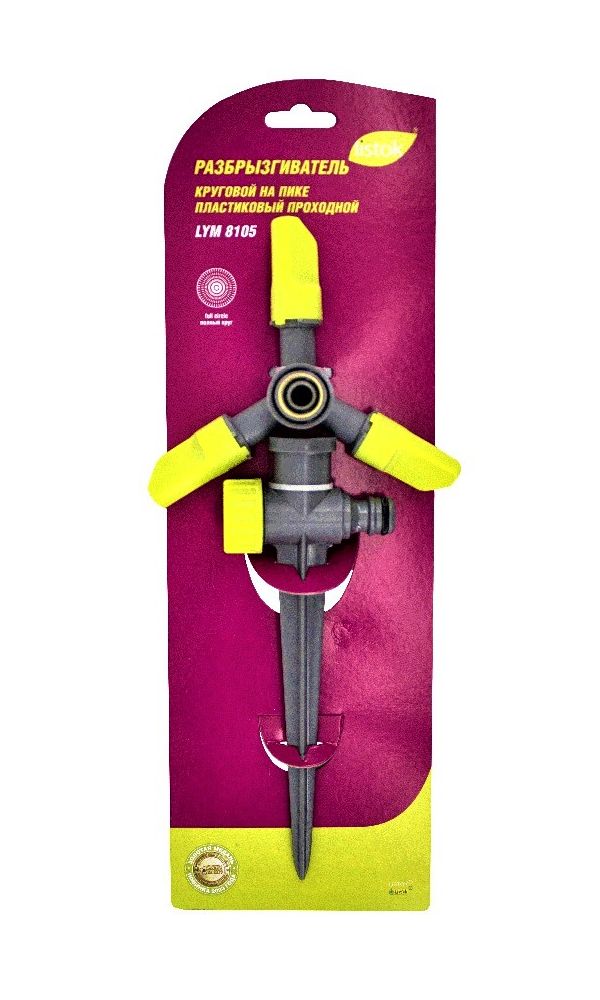 Применяется для полива растений. Проходная форма, с двумя соединительными гнездами, обеспечивает использование его в системе полива. Пика надежно фиксирует разбрызгиватель в почве.
