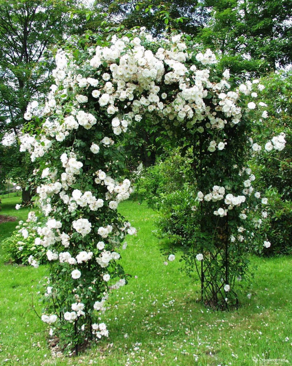 Открытый грунтОчень популярная вьющаяся роза с великолепными цветами. Цветки густомахровые (более 40 лепестков), кремово-белые, собраны в пышные соцветия, на фоне тёмно-зелёной, блестящей листвы выглядят особенно ярко. Аромат, исходящий от них, лёгкий и не навязчивый, приятный, фруктовый, с нотками цитрусовых. Цветение яркое и продолжительное, может длиться вплоть до самых заморозков. Она идеально подойдет для создания сада в романтическом стиле, ею отлично декорировать арки, а также использовать для букетов.