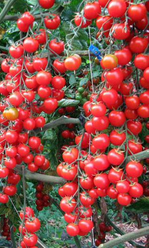 Раннеспелый, индетерминантный сорт для закрытого грунта. Кисть очень длинная, поникающая, состоящая из 18-20 сахарных плодов. Плоды красного цвета, округлые, массой 15-20 г плотные, очень сладкие, собраны в длинные, красивые кисти по 18-20 плодов. Плоды в кисти созревают...