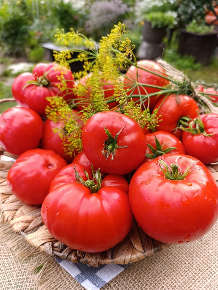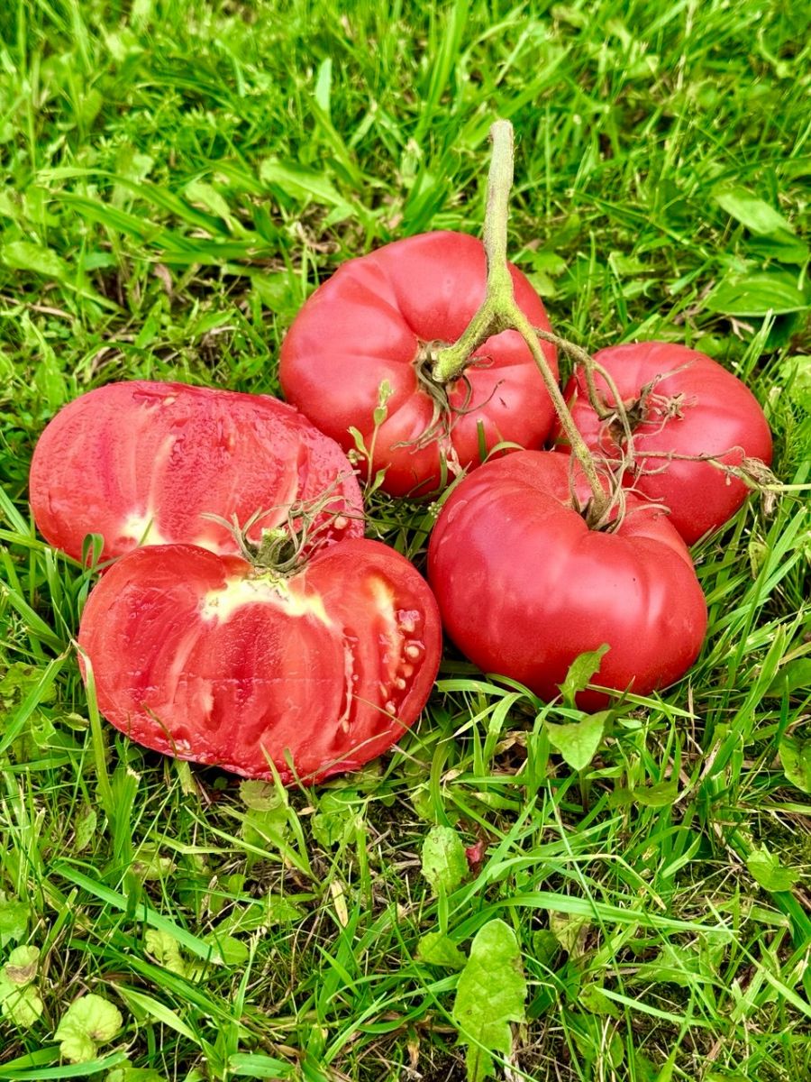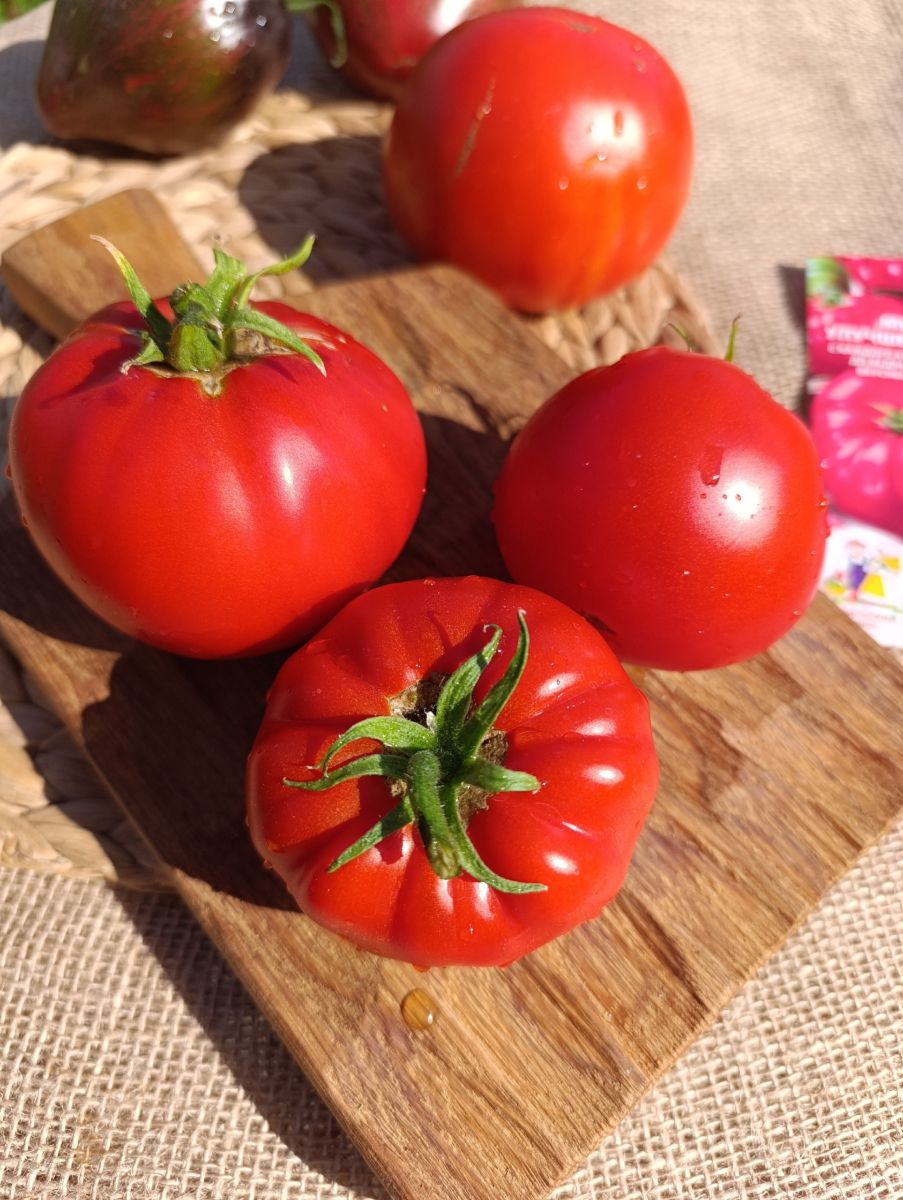 Плоды первых кистей особо крупного размера, весом до 1 кг, способны накормить вкусным салатом целую семью! Сорт среднеспелый, светолюбивый, хорошо плодоносит в открытом грунте, даже предпочтительнее, чем в теплице. Урожайность до 10 кг/м2. Растение среднерослое, высотой до 1,5 м. Плоды гладкие, округло-плоские, красно-малинового цвета, плотные, с сахаристой мякотью и малым количеством семян, устойчивые к растрескиванию. Сорт отзывчив к поливу и регулярным подкормкам комплексными удобрениями, чувствителен к недостатку бора и калия в почве.