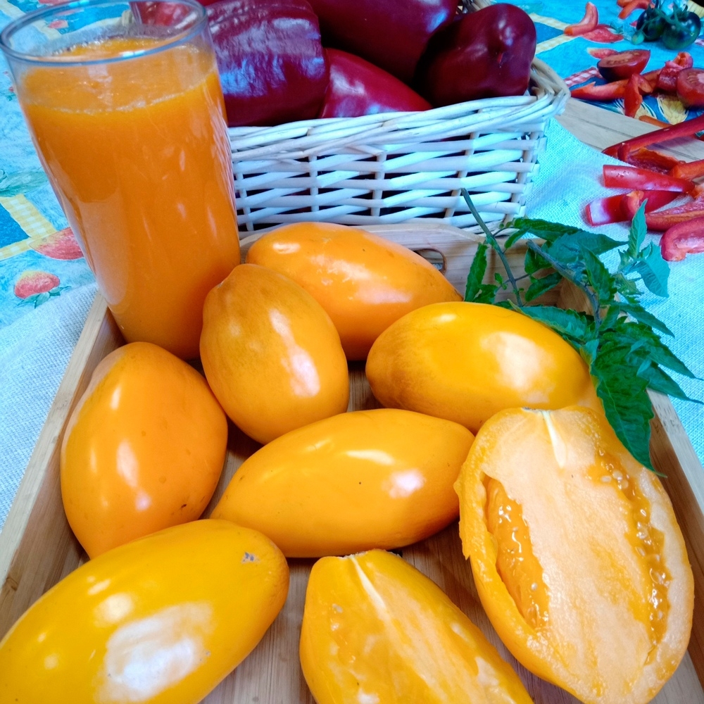 Индетерминантные растения высотой 2 м требуют подвязки. Плоды мясистые, гладкие, оранжевые, массой 90-115 г. Не растрескиваются. Сорт ценится за прекрасный вкус и отличный товарный вид плодов. Рекомендован для свежего потребления и изготовления сока. Сок целебный, с высоким содержанием каротина, по цвету и вкусу напоминает абрикосовый.